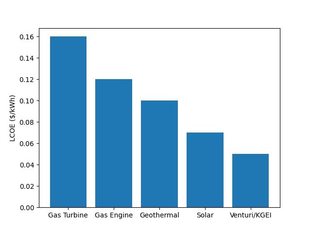 Venturi-KGEI power systems deliver fuel-free baseload electricity with no fuel cost, minimal infrastructure, and very low maintenance, dramatically reducing lifecycle energy costs compared to all competing technologies.